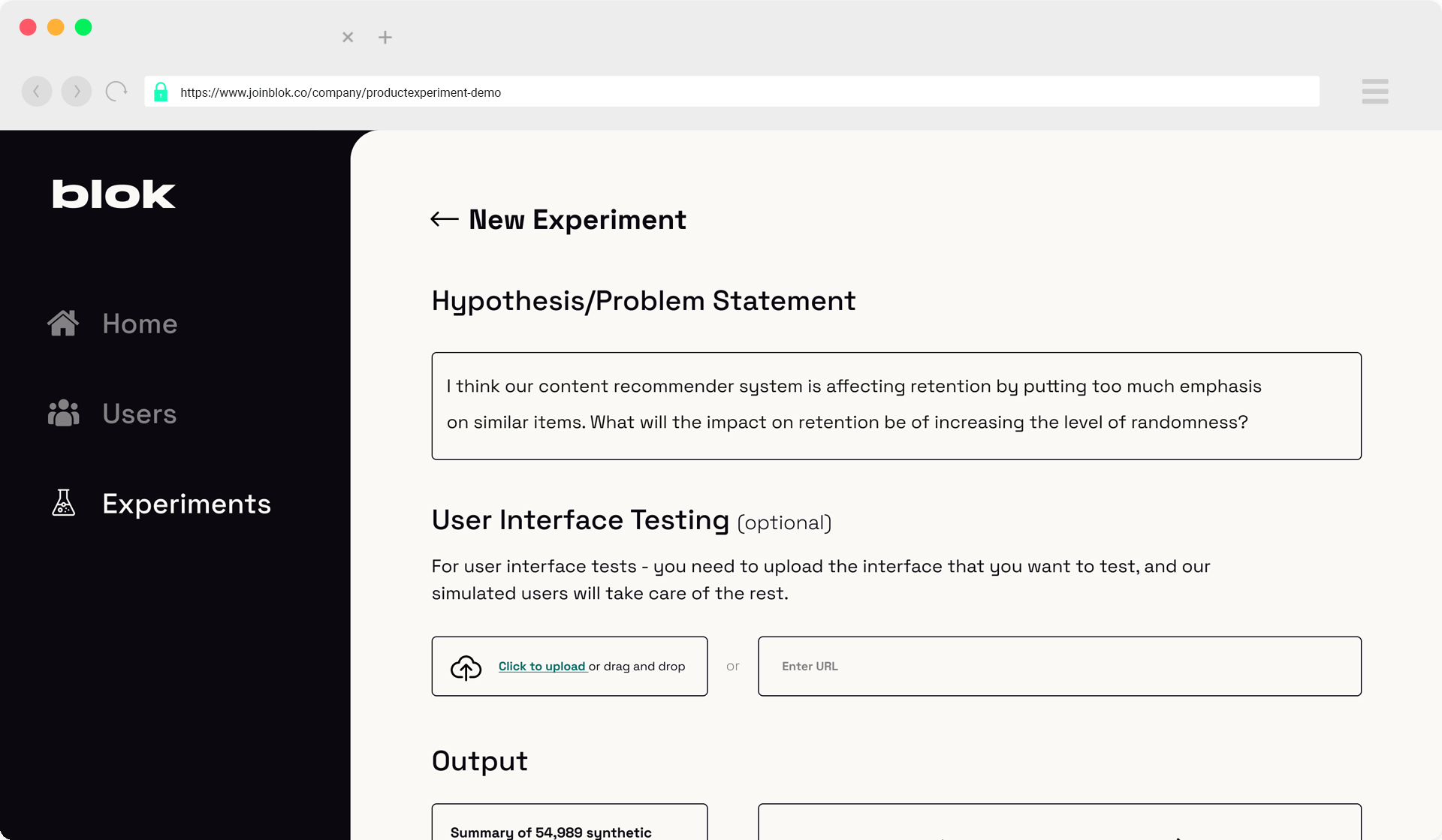 A/B testing is retrospective: it tells you what worked after exposing real users to different variants, often requiring significant traffic and time to reach significance. Blok is predictive. We simulate how different types of users, modeled after real behavioral clusters, will respond to a change before it goes live. This allows teams to de-risk decisions, compare variants faster, and prioritize ideas with higher behavioral upside without needing to wait weeks for live test results.