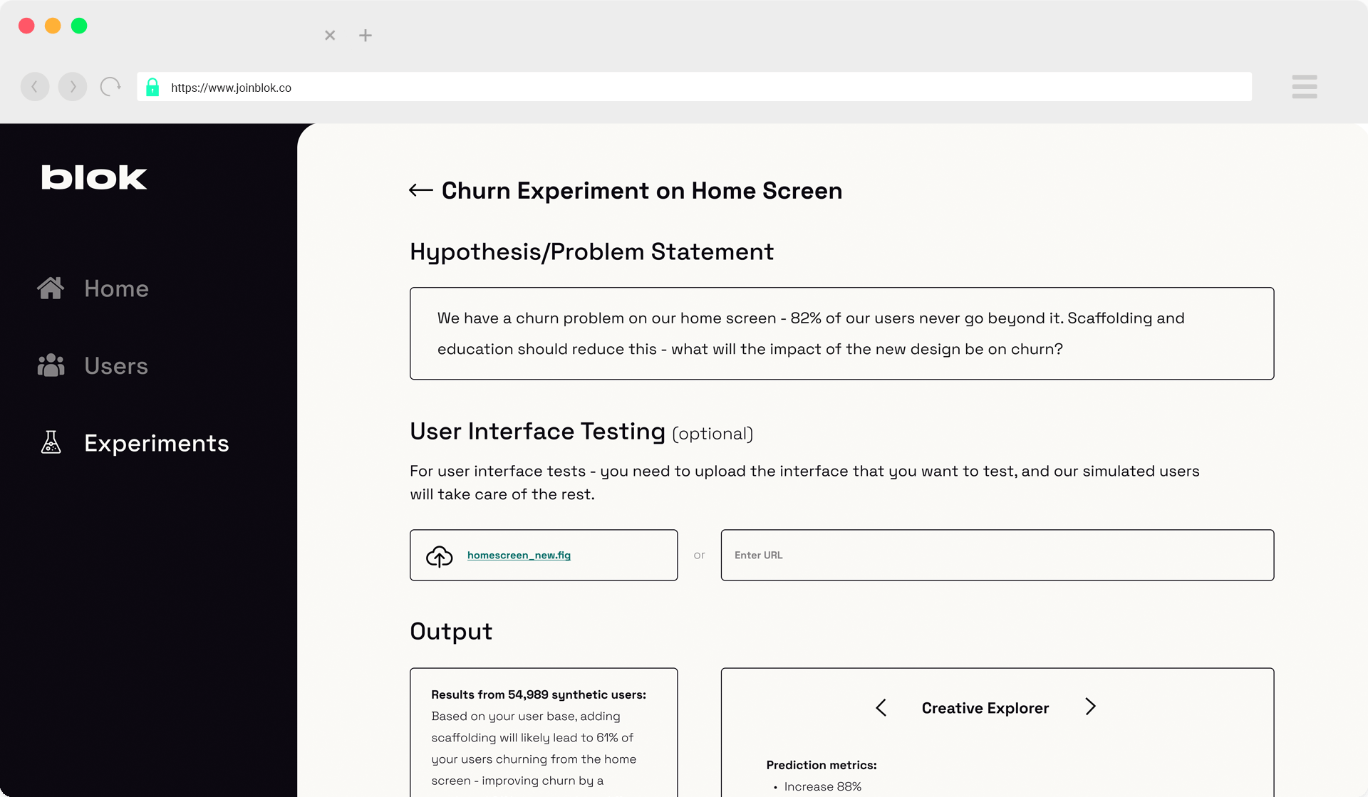 A/B testing is retrospective: it tells you what worked after exposing real users to different variants, often requiring significant traffic and time to reach significance. Blok is predictive. We simulate how different types of users, modeled after real behavioral clusters, will respond to a change before it goes live. This allows teams to de-risk decisions, compare variants faster, and prioritize ideas with higher behavioral upside without needing to wait weeks for live test results.